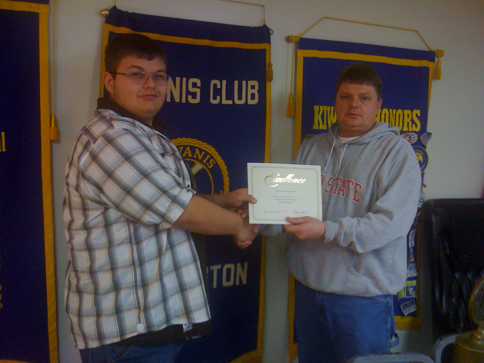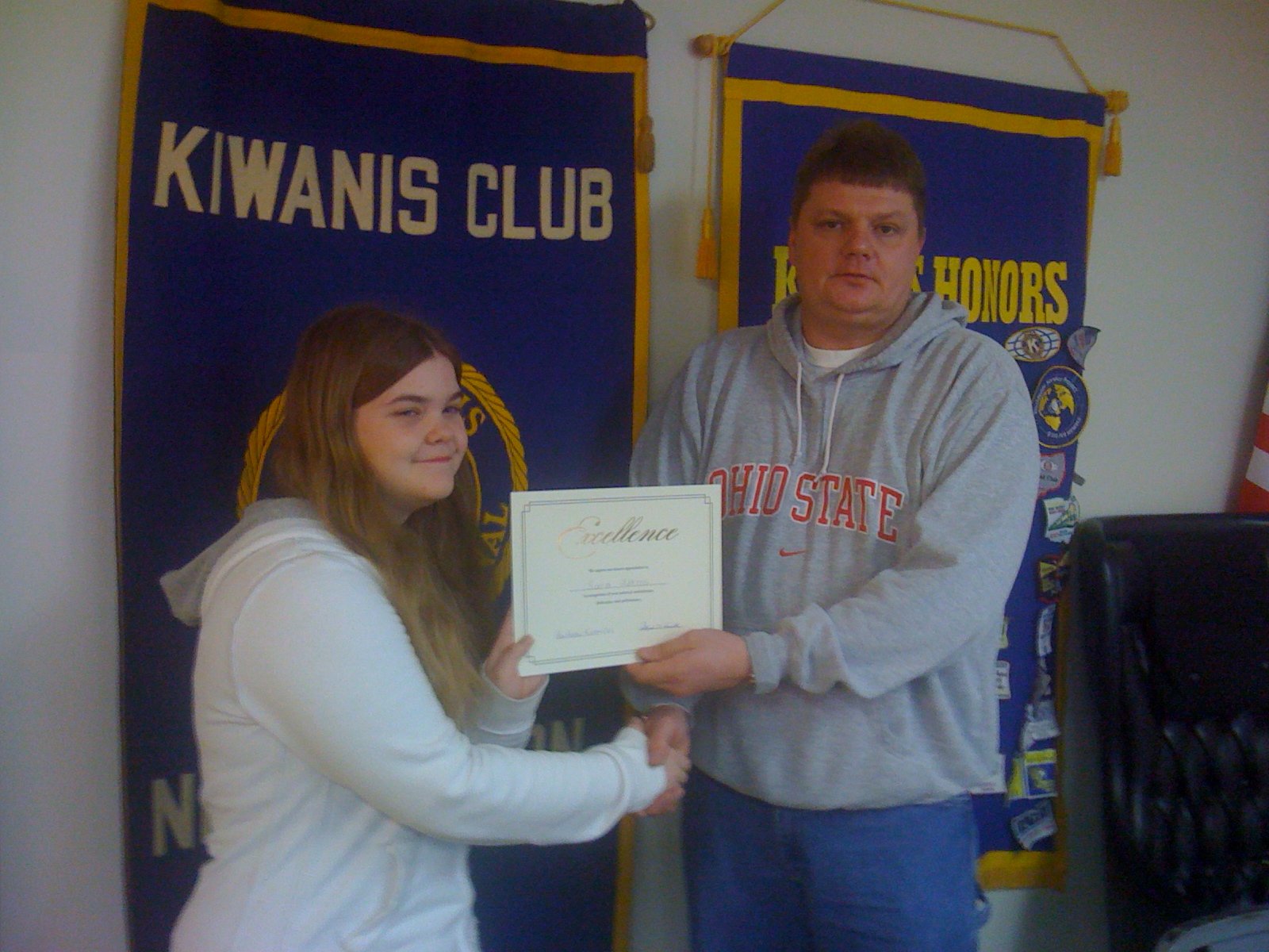 New Boston Kiwanis honored Glenwood High School students Sara Adkins and Aaron Hannah for winning the state championship this year in the Americanism and Government Test. Adkins is a sophmore and daughter of Mr. and Mrs. Raymond Adkins, and Hannah, a senior, is the son of Mr. and Mrs. Charles Hannah. Both students have won trips to Washington D.C. this spring and are being recognized by New Boston Village Council for their outstanding achievement. Pictured is New Boston Kiwanis President and Village Administrator Steve Hamilton presenting certificates.